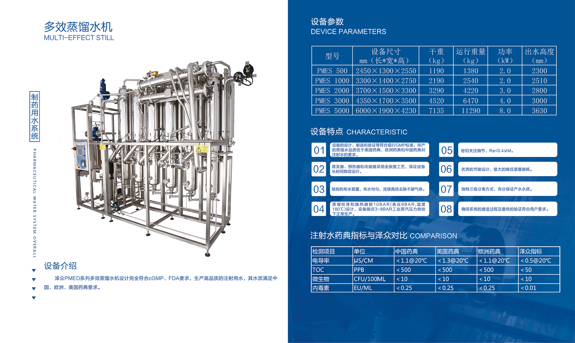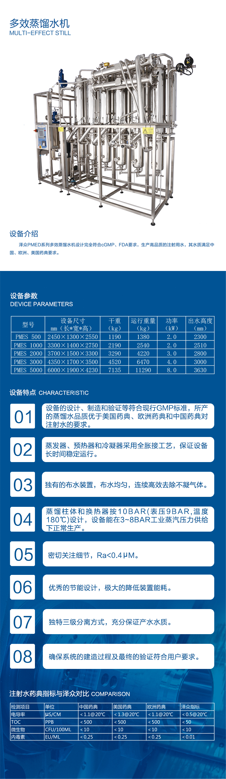 1. 设备产水水质符合中国药典、美国药典、欧盟药典对注射水的要求。