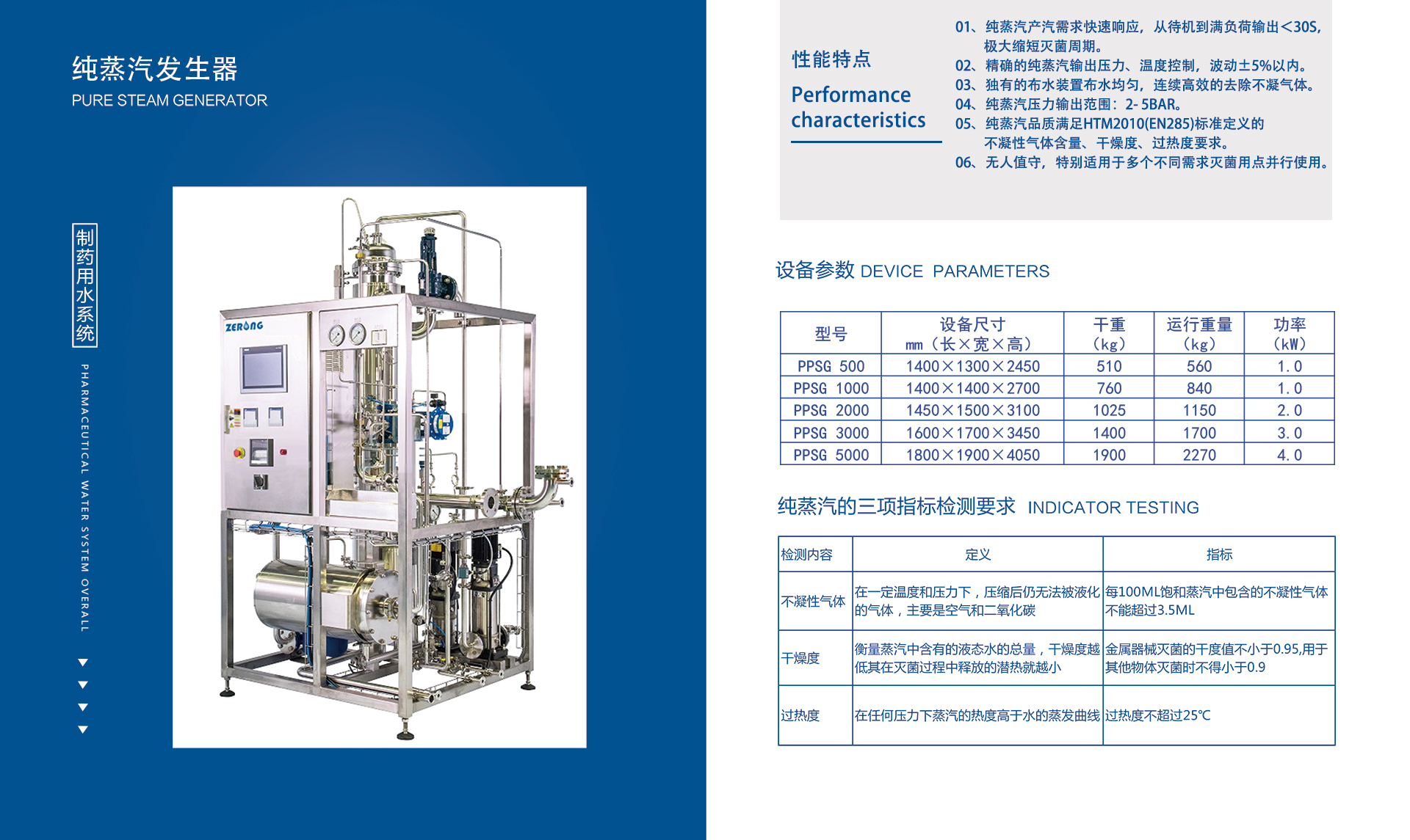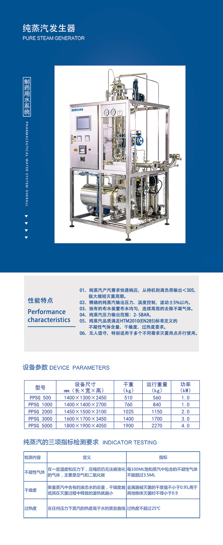 纯蒸汽品质满足HTM2010(EN285)所规定的不凝气体含量、干燥度、过热度的要求。